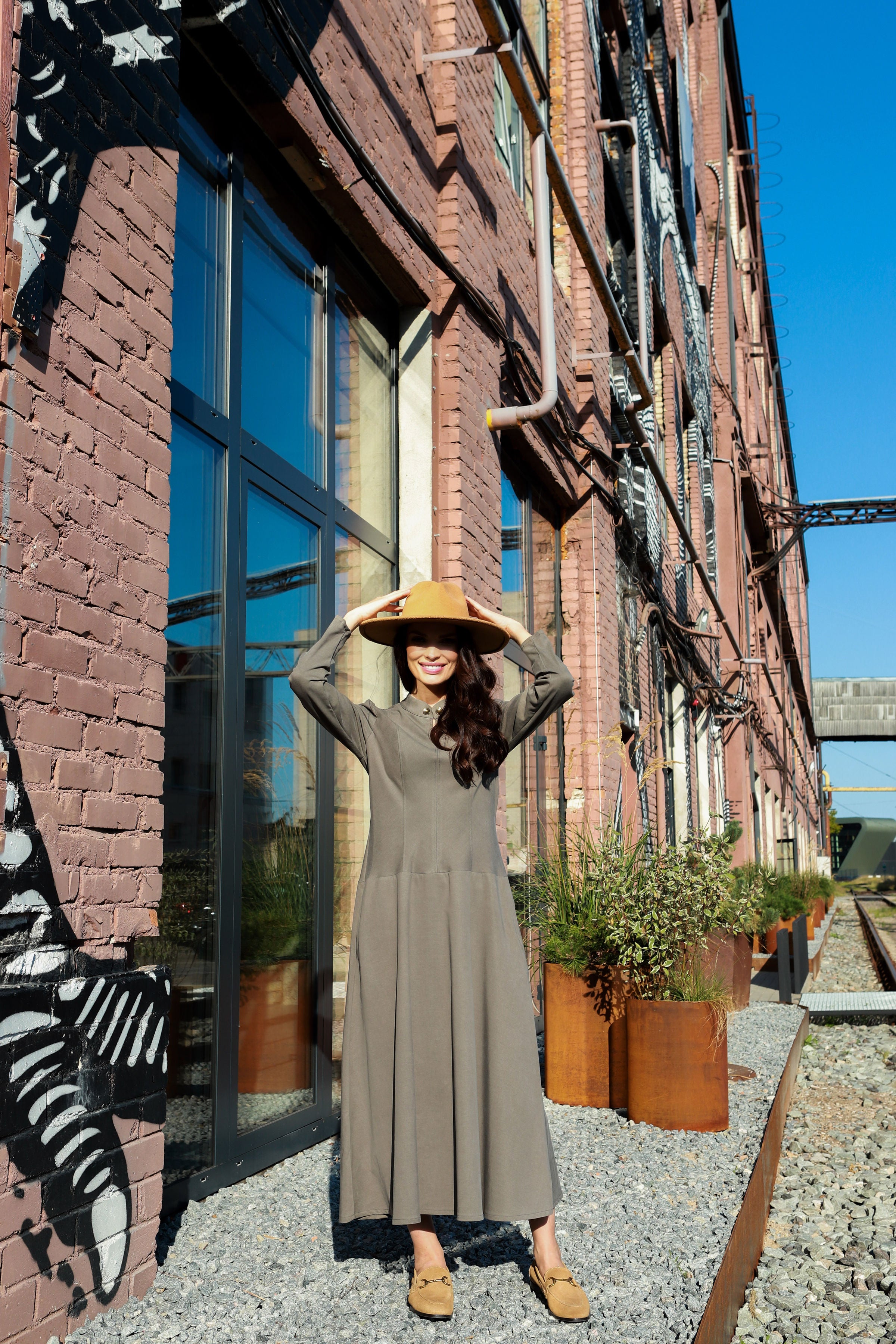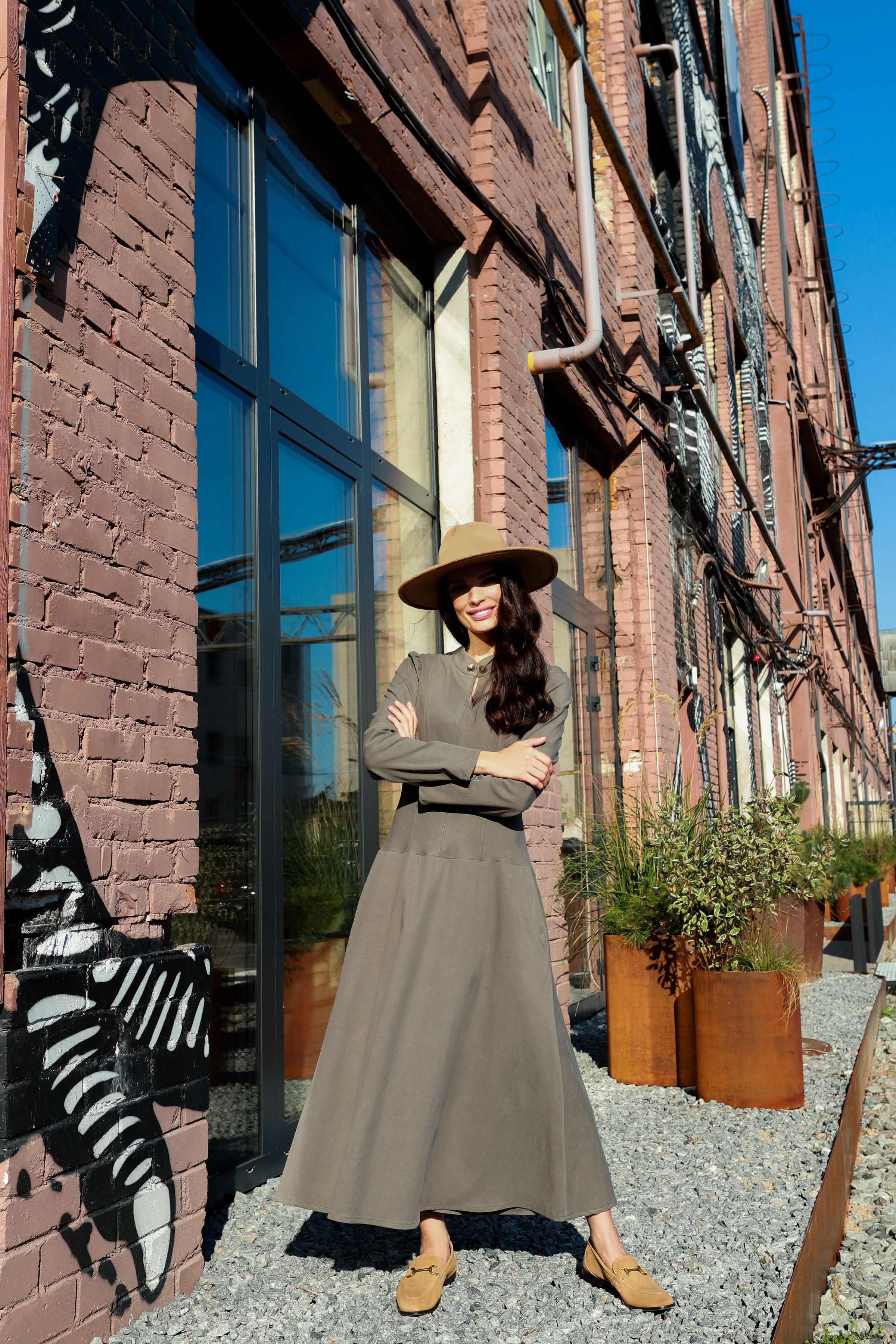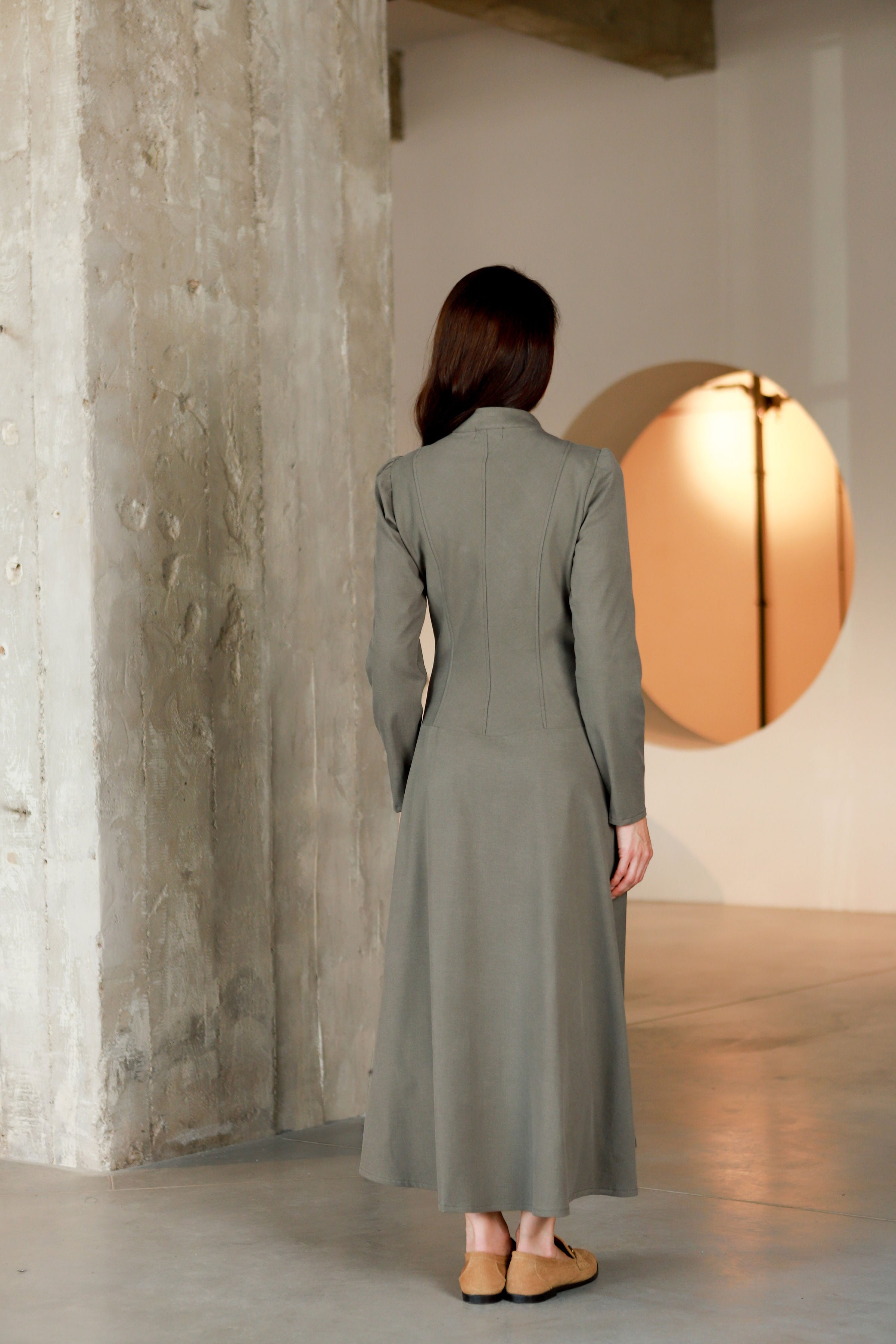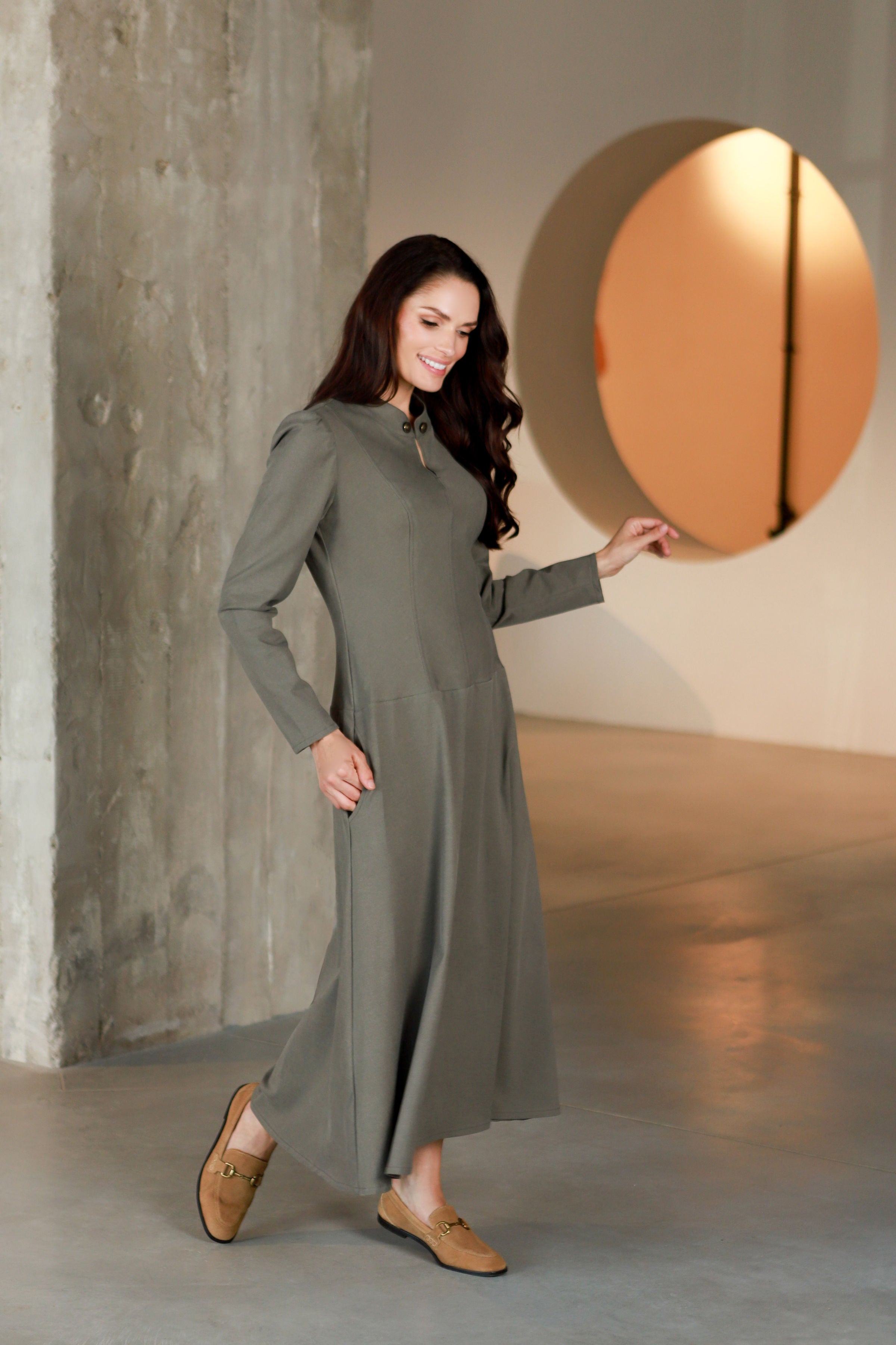 Elegantiška suknelė su stove ir sagutėmis „SELENA“ žalvario pilka
